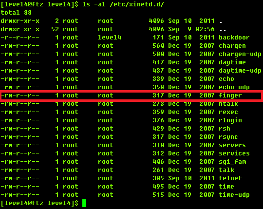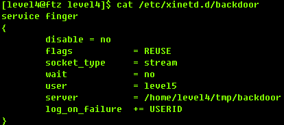 그럼 xinetd특성상 finger 네트워크 서비스를 요청받을 때 마다 /home/level4/tmp/backdoor바이너리를 실행한다고 볼 수 있습니다.