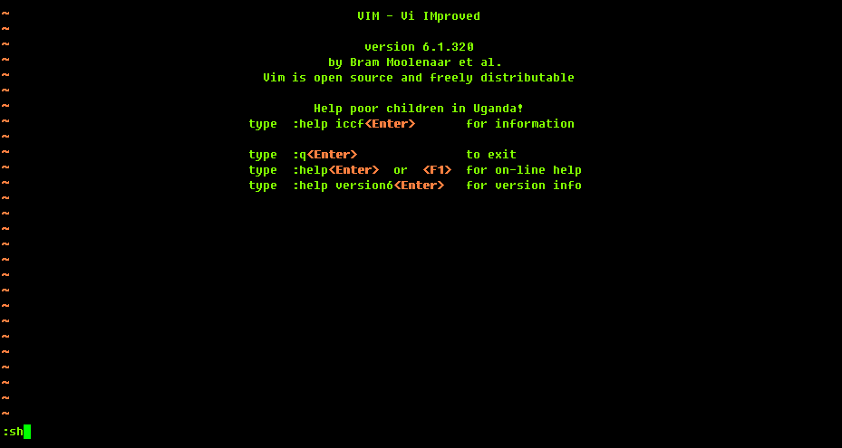 실행해주면, VIM 에디터가 실행되는데, vim의 명령중 sh를 실행 해 줍시다.